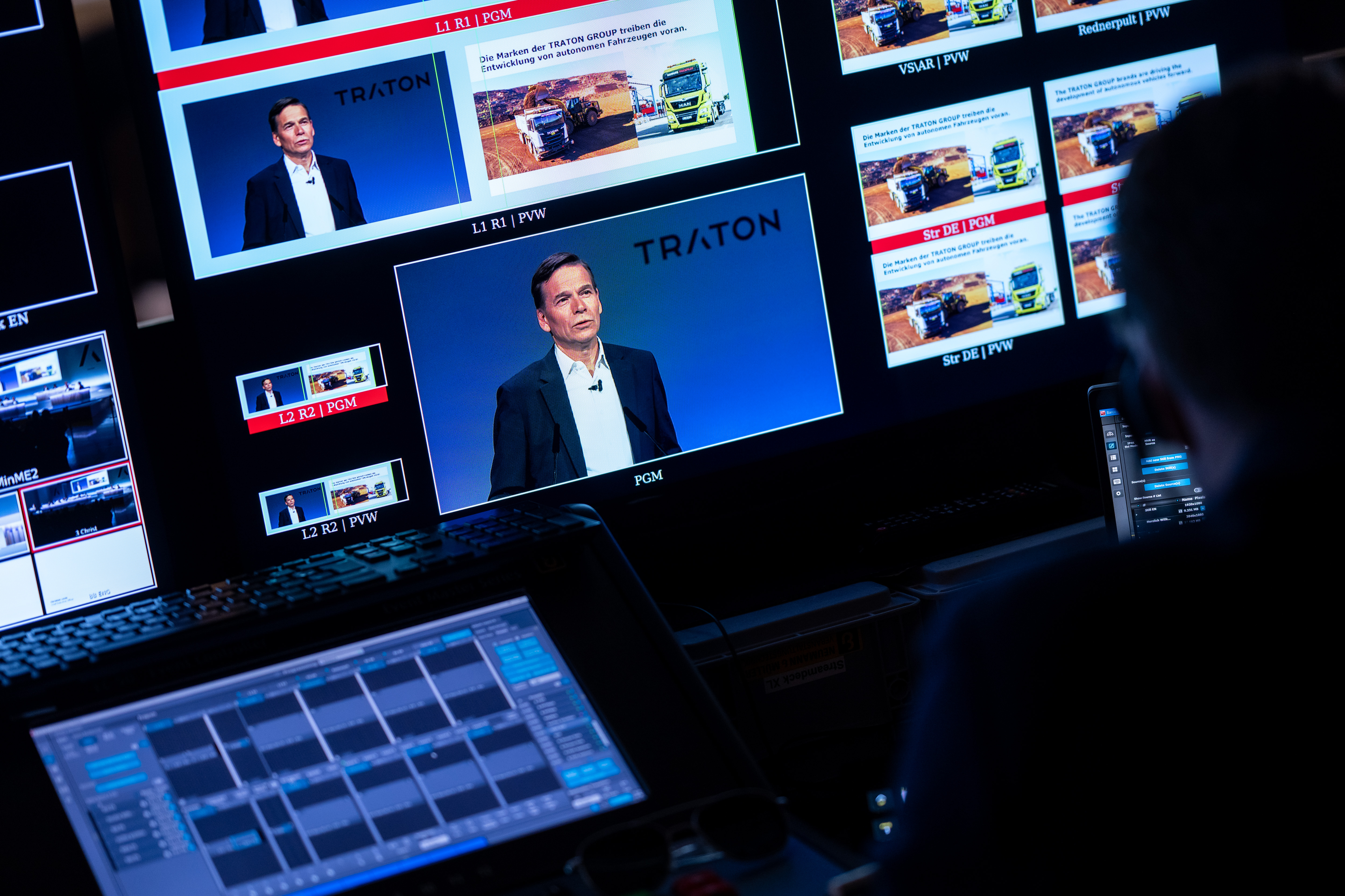 Hinter den Kulissen laufen die Monitore der Techniker auf Hochtouren, um die Rede des CEO auf allen Kanälen zu übertragen.