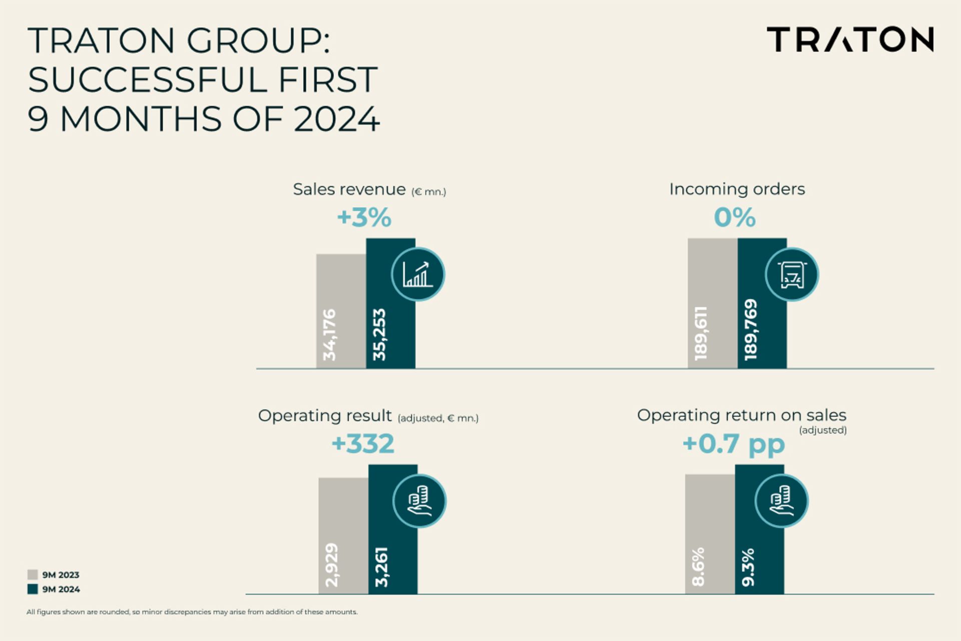 Christian Levin, CEO of the TRATON GROUP: “In the first nine months of 2024, the TRATON GROUP continued to implement its strategy very successfully. Although the European market in particular remains challenging, our brands show resilience and focus in all our market environments globally. The year-on-year increase of 0.7 percentage points in our adjusted operating return on sales to an impressive 9.3% is convincing evidence. I am optimistic about the future of the TRATON GROUP. Our brands are continuously bringing additional service offers that will give us even more stability as a Group in volatile markets. In the fourth quarter, MAN will launch the digital platform SimplePay, thereby offering customers better cost management of their fleets. Effective October 1, the rebranding of our North American TRATON brand as International went hand in hand with a shift in strategy to transform the business into a stronger provider of end-to-end solutions. International’s portfolio includes parts, maintenance, financing, connectivity, and charging. At IAA in Hannover, Scania presented its Services 360, demonstrating how a modular services package helps customers in the highly competitive logistics market. As a Group, we are focusing more on portfolio management for our customers and their fleets with the aim of generating maximum value from the vehicle fleet. The transformation to sustainable transport remains our most ambitious purpose and strategy. That’s why it’s so important that MAN has now started delivering its all-electric trucks. And that Volkswagen Truck & Bus has initiated the homologation for approval of the new eVolksbus. Our brands are on track to live our important purpose: “Transforming Transportation Together. For a sustainable world”. Nonetheless, this represents an enormous social challenge. We need to partner with and get the support of politics, network providers, and energy suppliers. This partnership and common contribution are crucial if we are to achieve sustainable transport.”